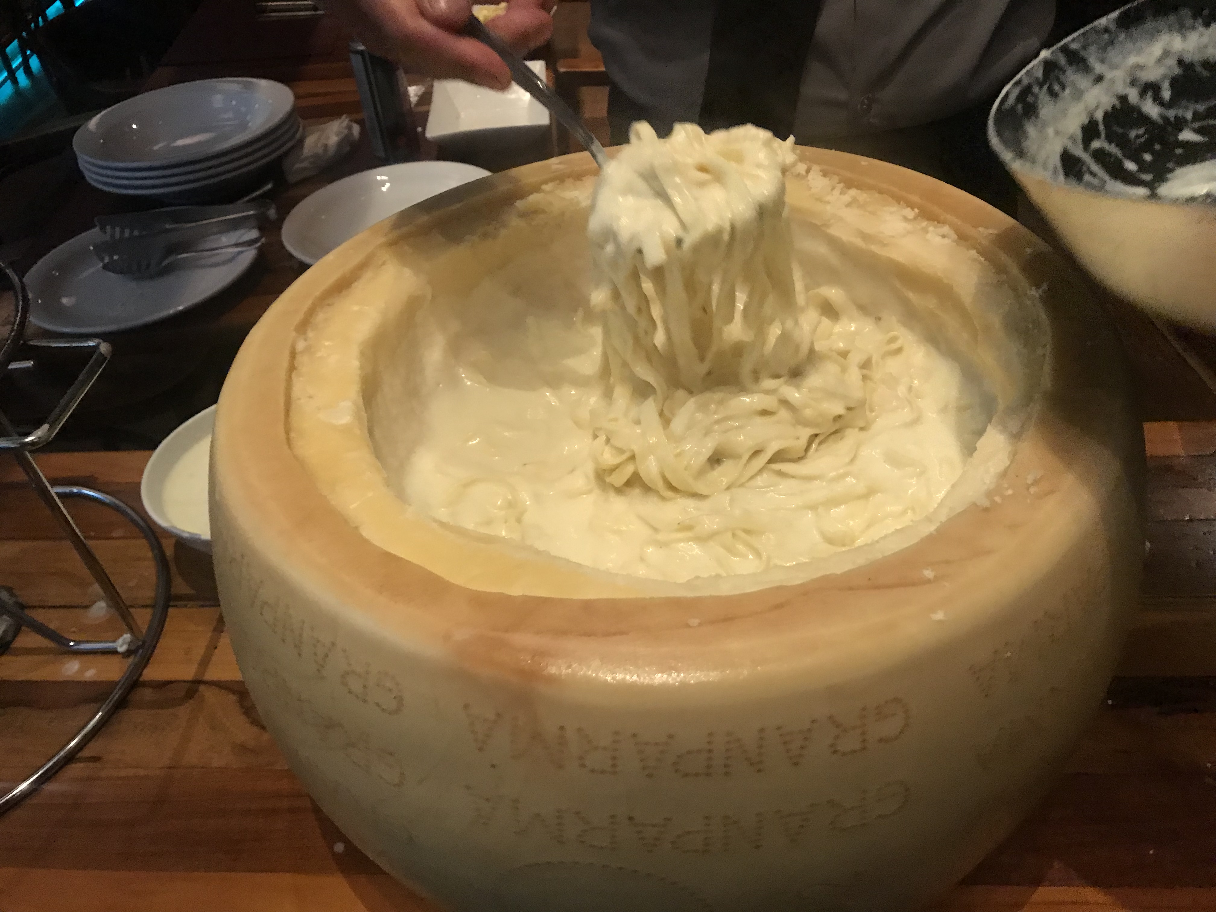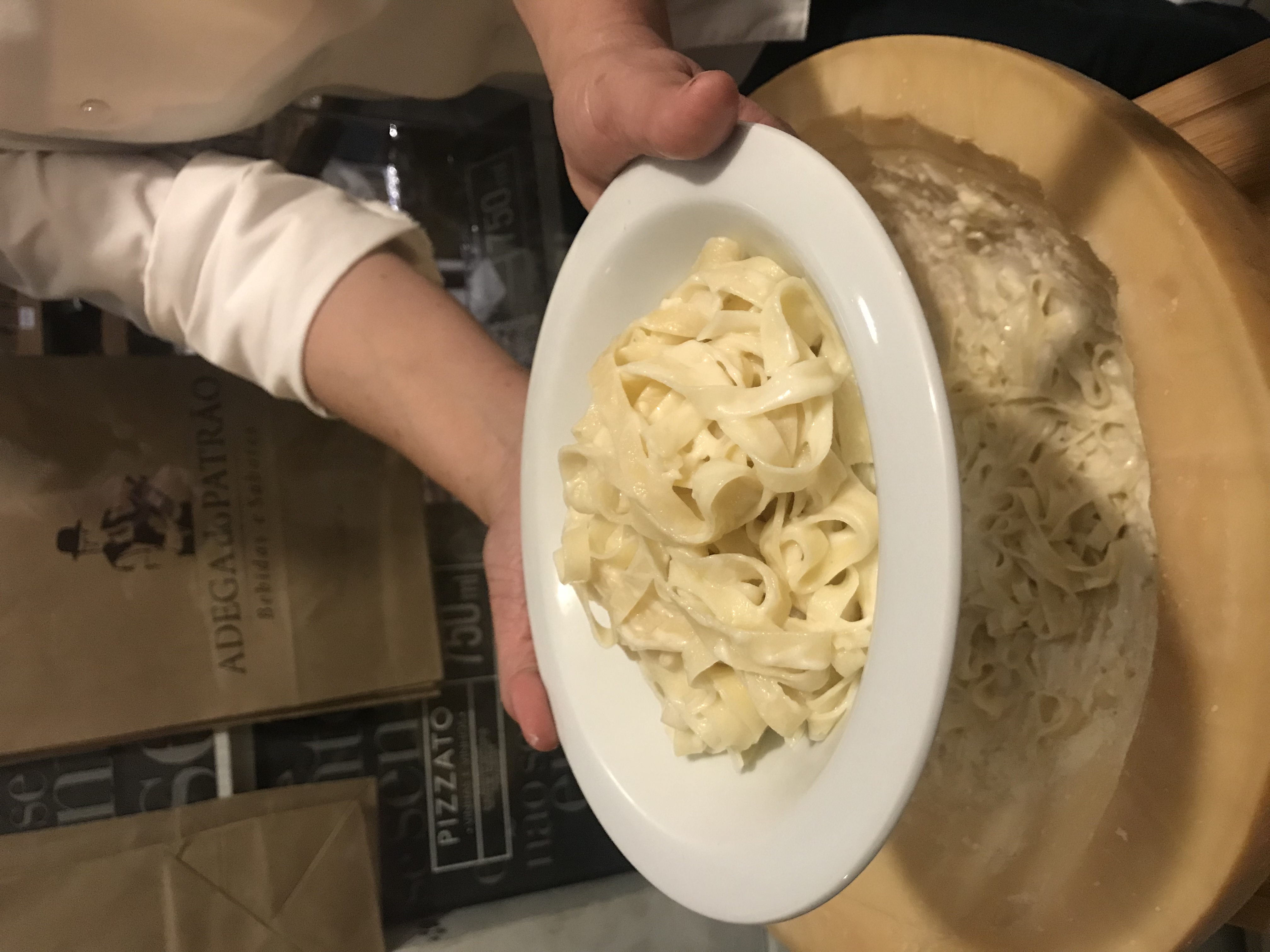 Se você tiver um belo queijo Granapadano raspe um pouco do queijo e coloque o macarrão e vai colocando o molho aos poucos e misturando dentro do queijo. Se você não tiver o queijo granapadano, grande e redondo, não desanime. Faça o macarrão conforme receita acima e assim que estiver pronto escorra e coloque aos poucos o molho bechamel.