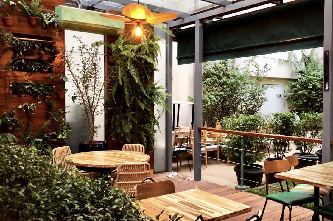 A decoração do ambiente utiliza jardim vertical e materiais reutilizáveis como madeira nas paredes, que juntos com as janelas de vidros espalhadas pelo local trazem luminosidade e leveza, explorando ao máximo a luz natural do dia.
