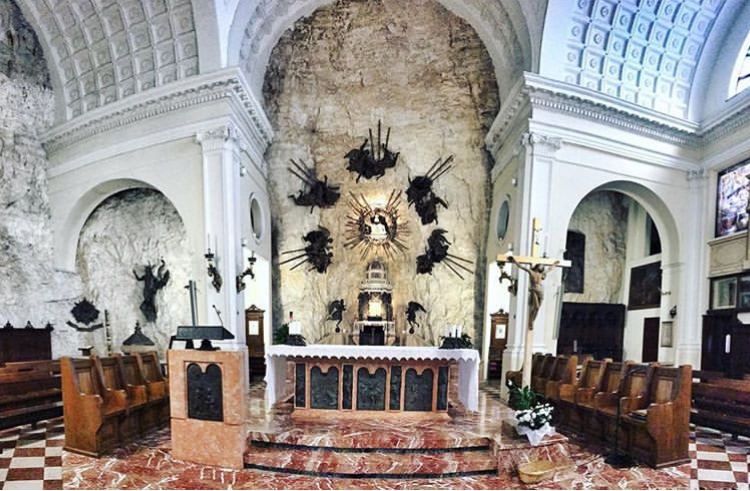 Incrustados na rocha, a fachada e o campanário da igreja são em estilo gótico, o que torna as proporções com a paisagem ainda mais interessantes. O interno é em estilo clássico e a grande cúpula é transparente, o que permite ver a rocha.