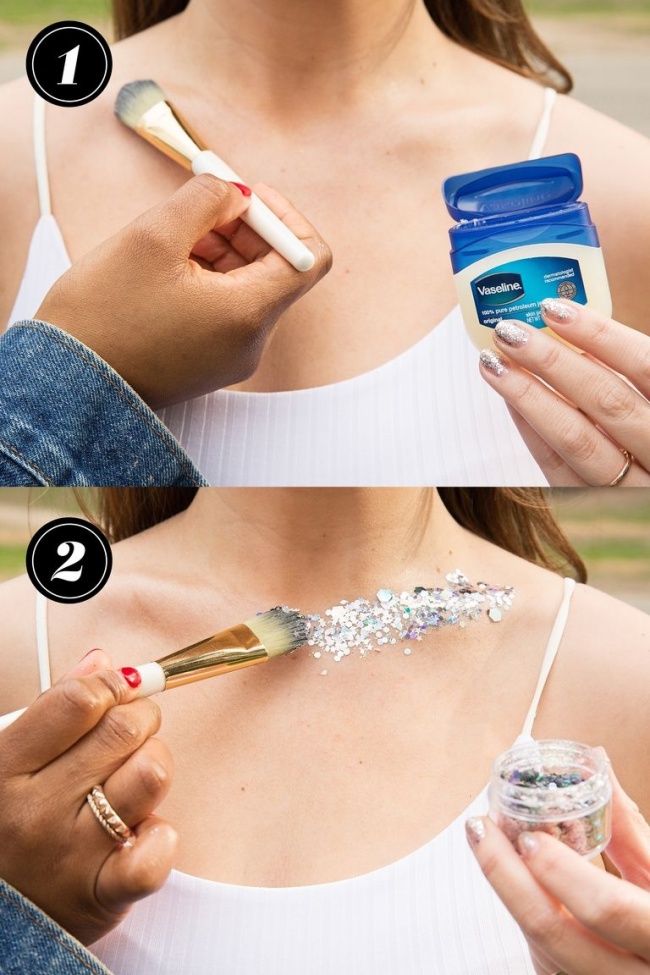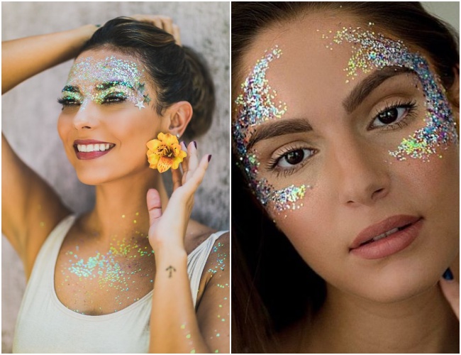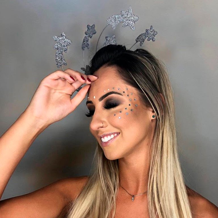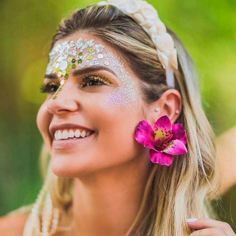 Já o glitter pode ser aplicado sem medo no colo, nos ombros e na clavícula para um look mega brilhoso no Carnaval! Use se possível o Glitter Biodegradável, uma sombra rosa cintilante, lápis branco na linha d’água dos olhos (truque que serve para iluminar o olhar!) e batom rosa.