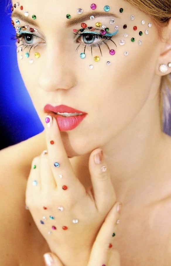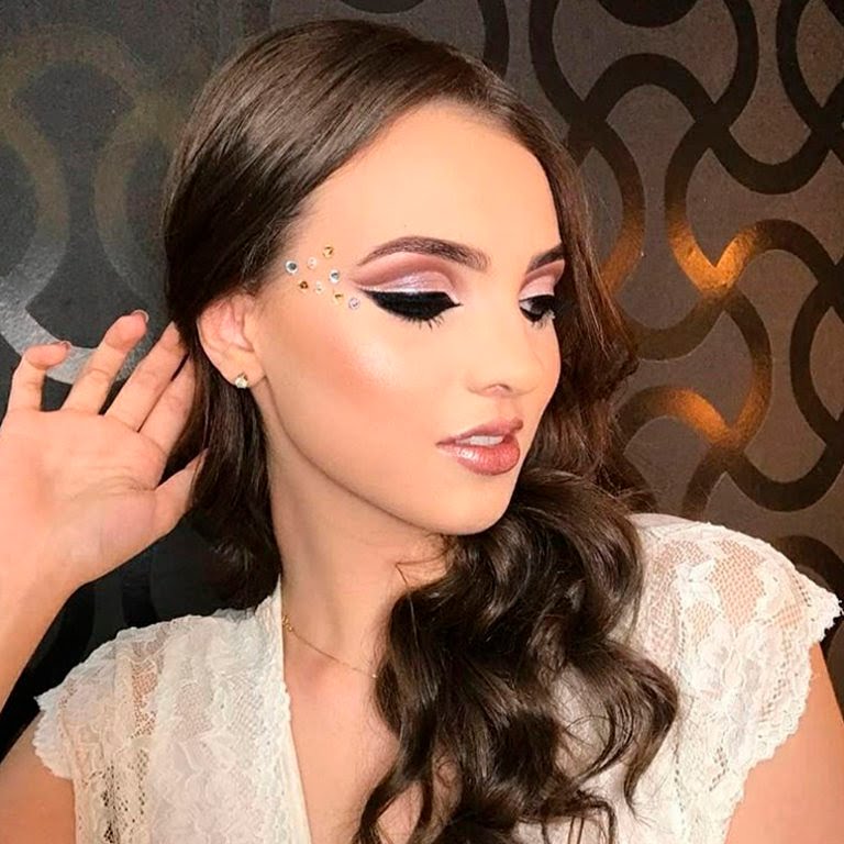 Para uma make de Carnaval caprichada no glitter, use uma sombra vermelha com muito glitter rosa por cima e, para iluminar o olhar, aplique um pouco de glitter dourado na parte de baixo dos olhos. Acima das sobrancelhas, muitas pedrinhas brilhantes.coloridas de strass da um charme da produção.