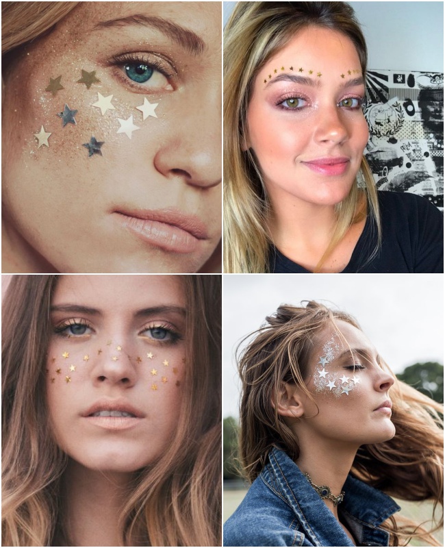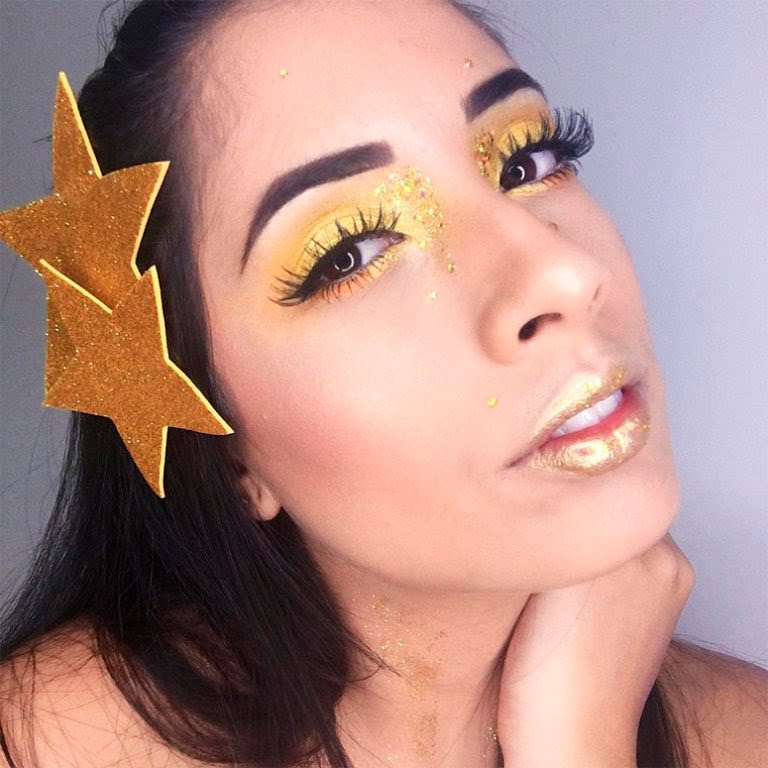 O delineado colorido, sombras de cores vibrantes, pele iluminada e muito glitter (Biodegradável pois o planeta agradece)